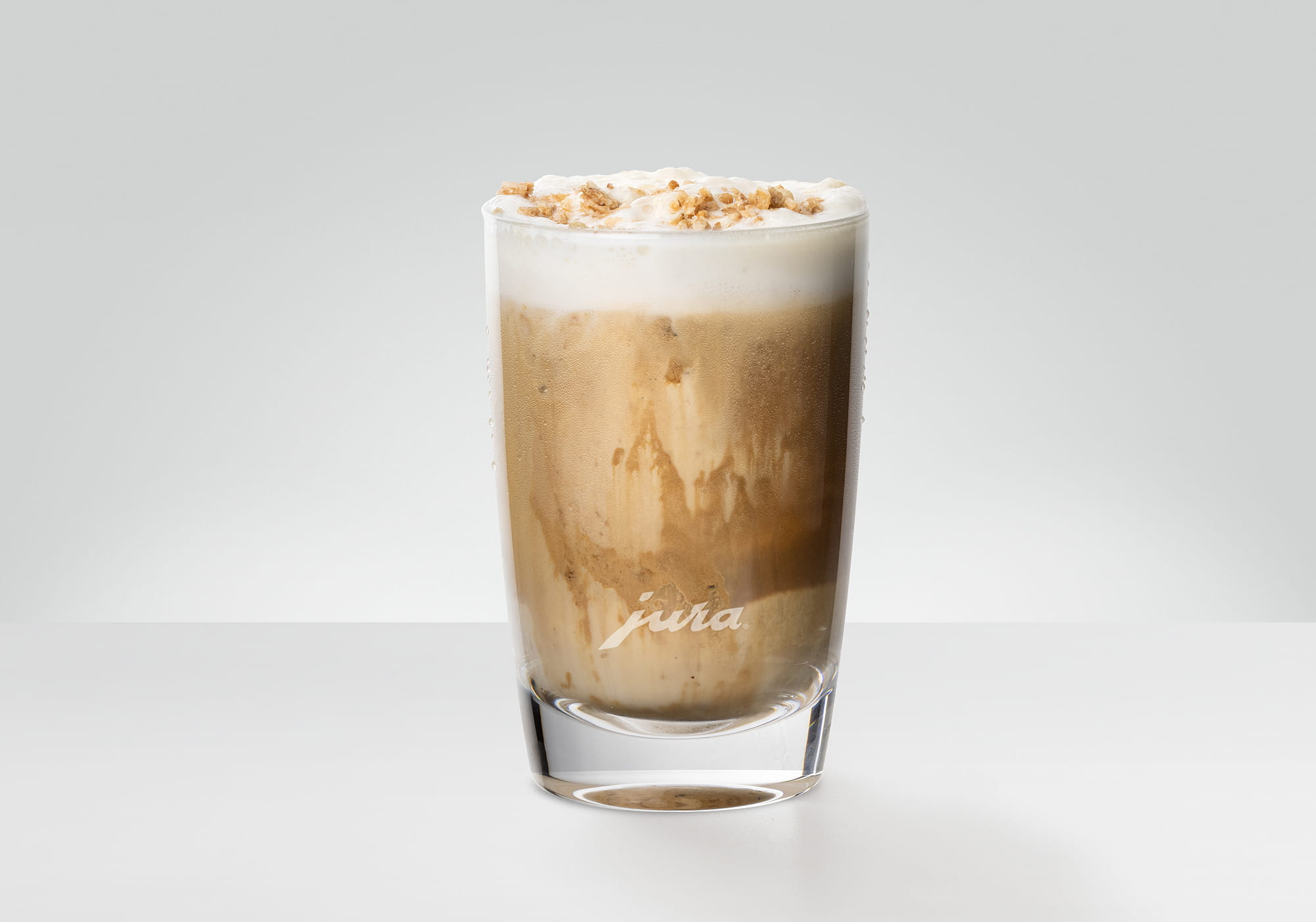 咖啡慢慢地流入玻璃杯中。 延长咖啡粉与水的接触时长,确保了天然香气的理想萃取。 咖啡搭配些许牛奶泡沫,提神,恢复能量。