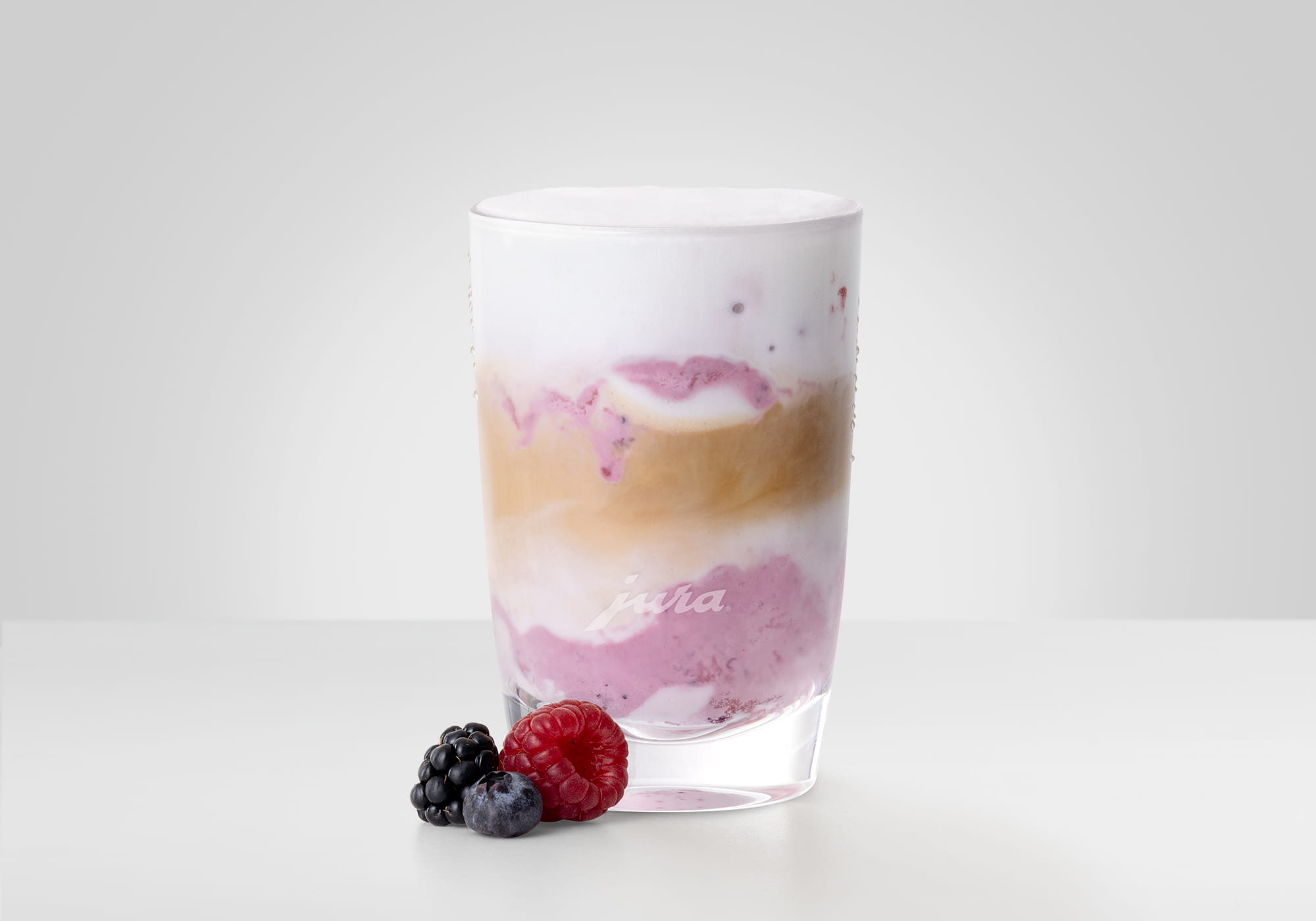 咖啡慢慢地流入玻璃杯中。 延长咖啡粉与水的接触时长,确保了天然香气的理想萃取。 咖啡搭配些许牛奶泡沫,提神,恢复能量。